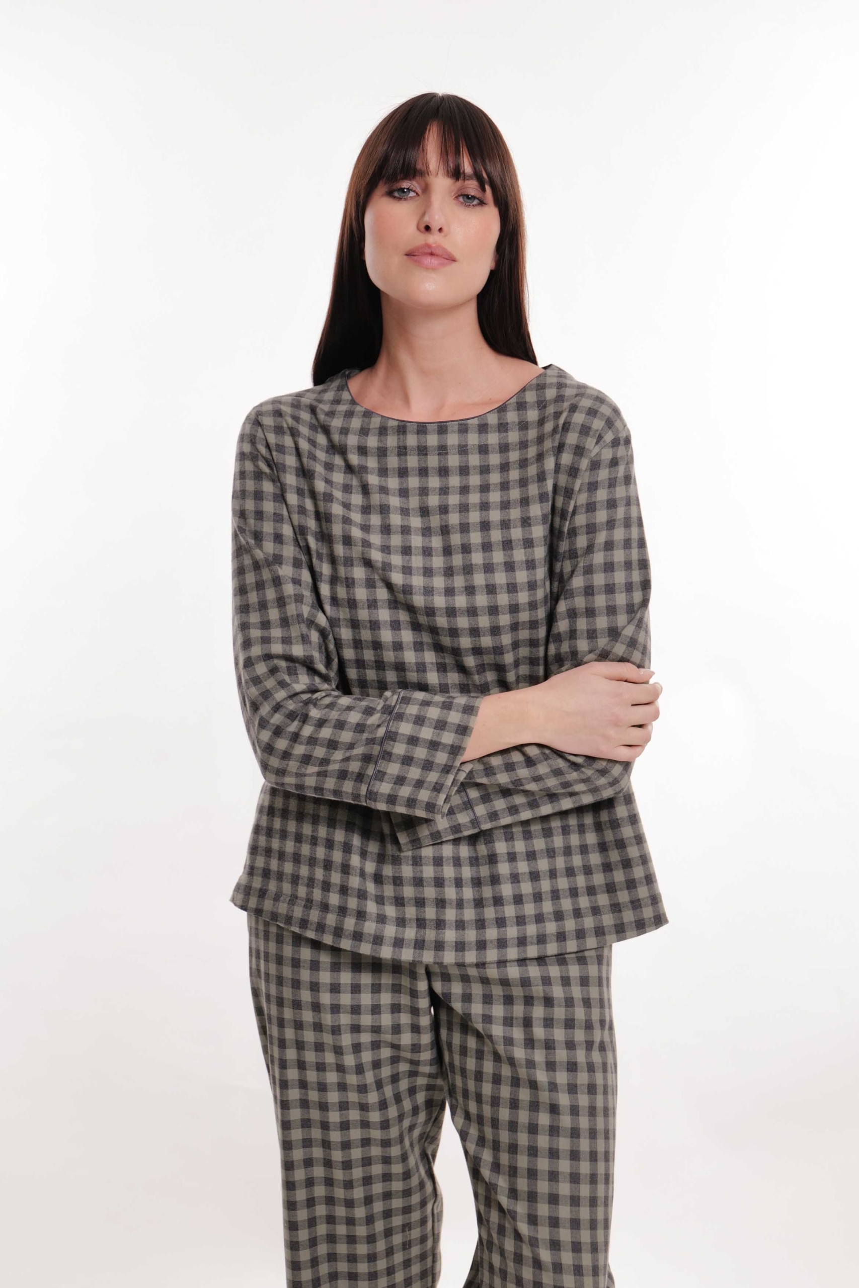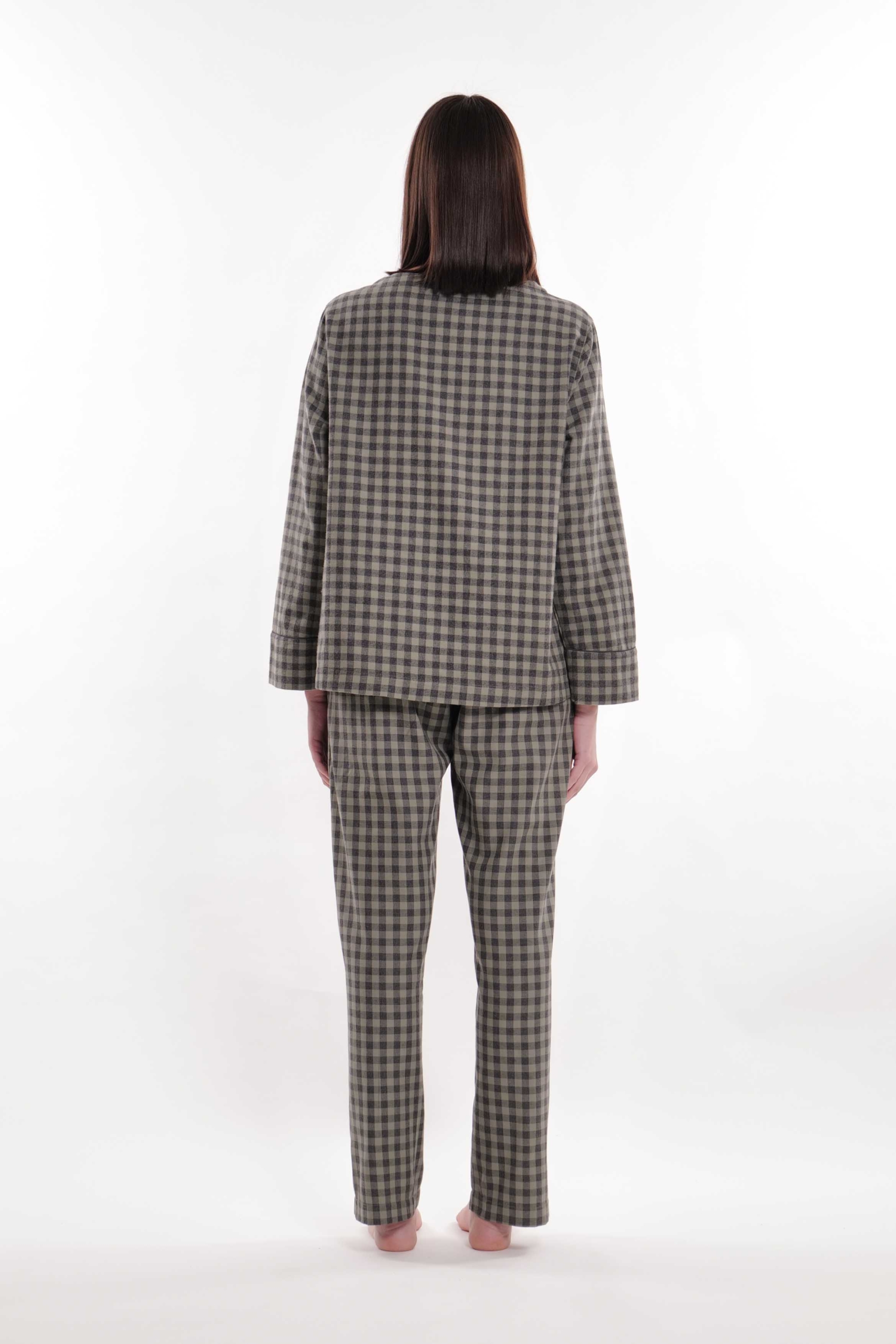 Lounge set in warm checkered cotton flannel, trousers with comfortable side pockets.