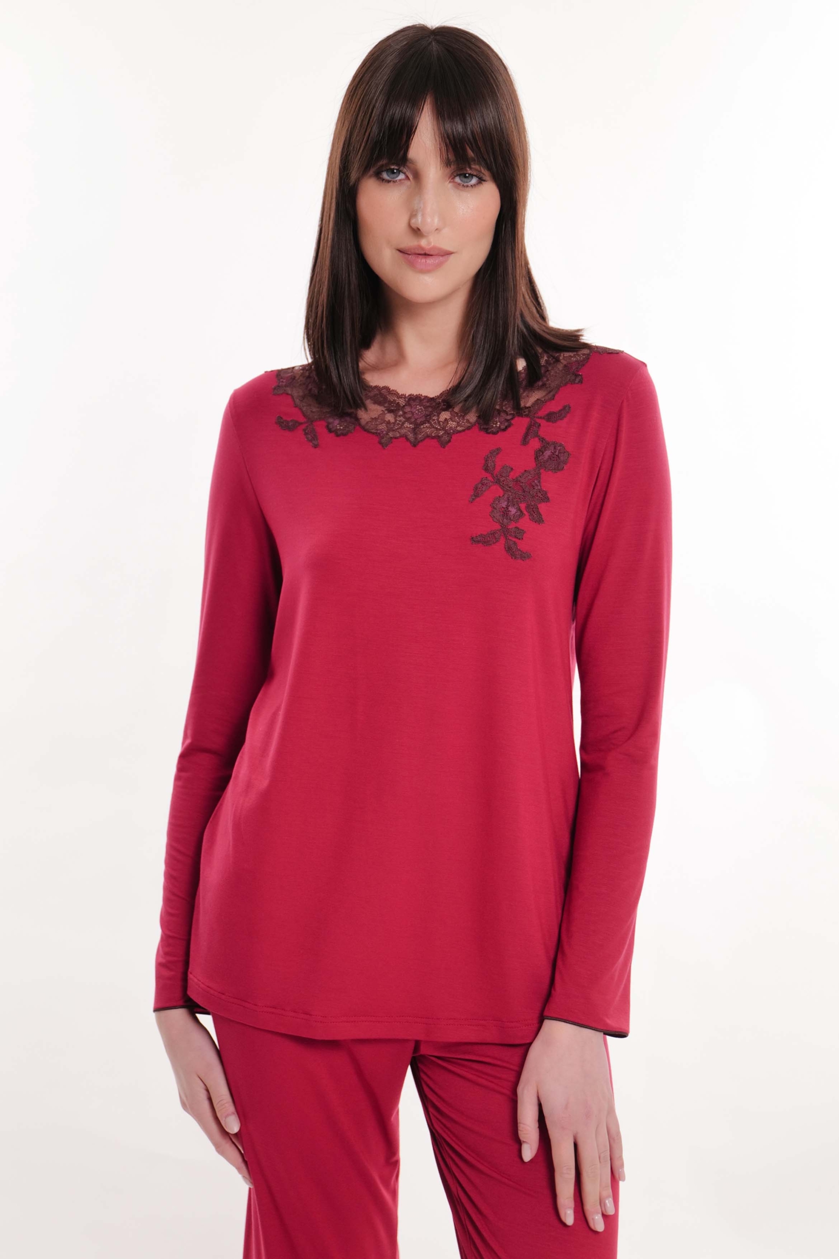 Pyjamas in Tencelâ„¢ micromodal jersey with contrasting frastaglio lace on the neckline and finishing.