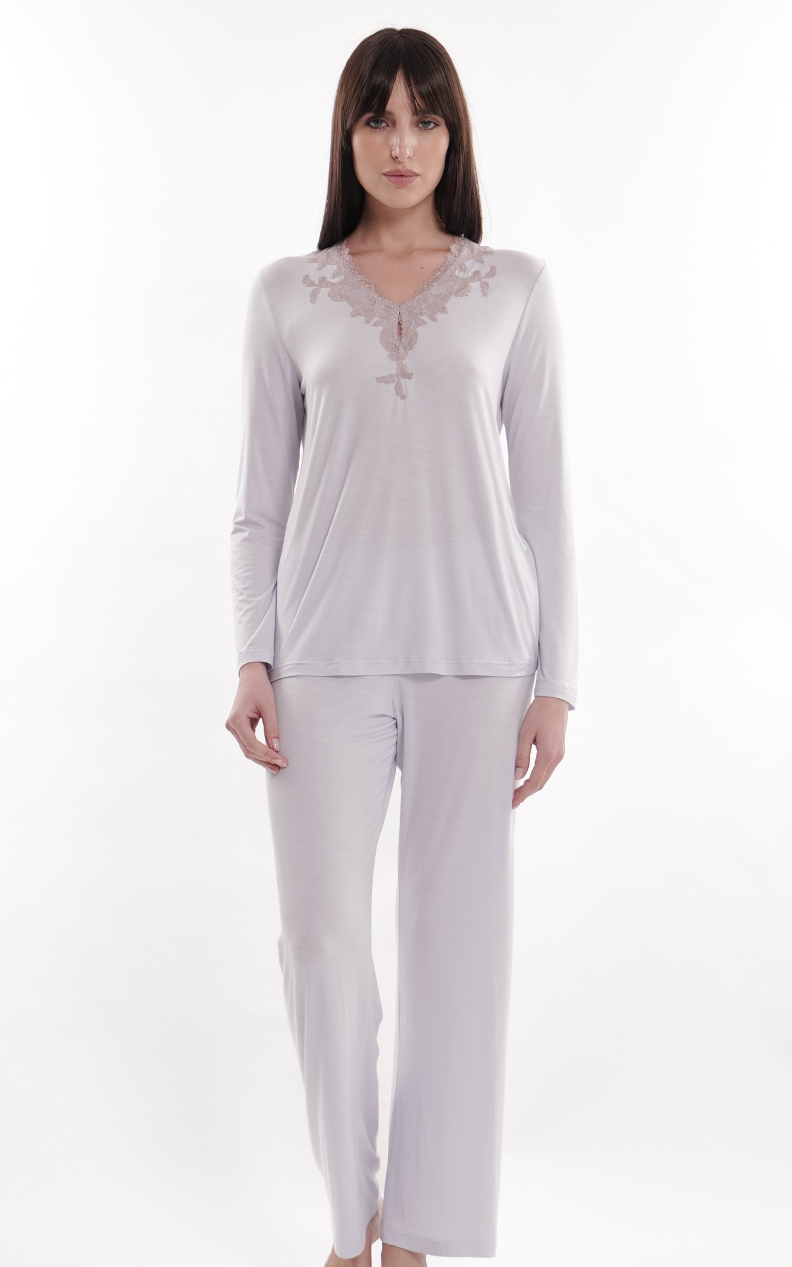 Pyjamas in Tencelâ„¢ micromodal jersey with contrasting frastaglio lace on the neckline and little central drop opening.