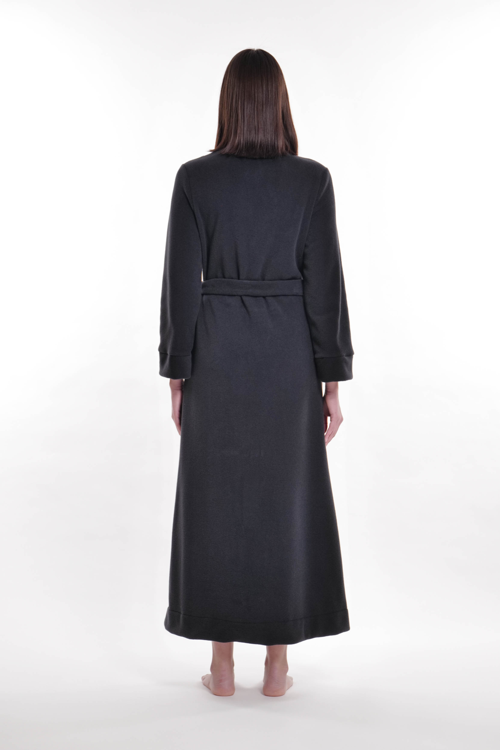 Robe in warm pile fleece in blended viscose with total opening with buttons, belt and comfortable side pockets.