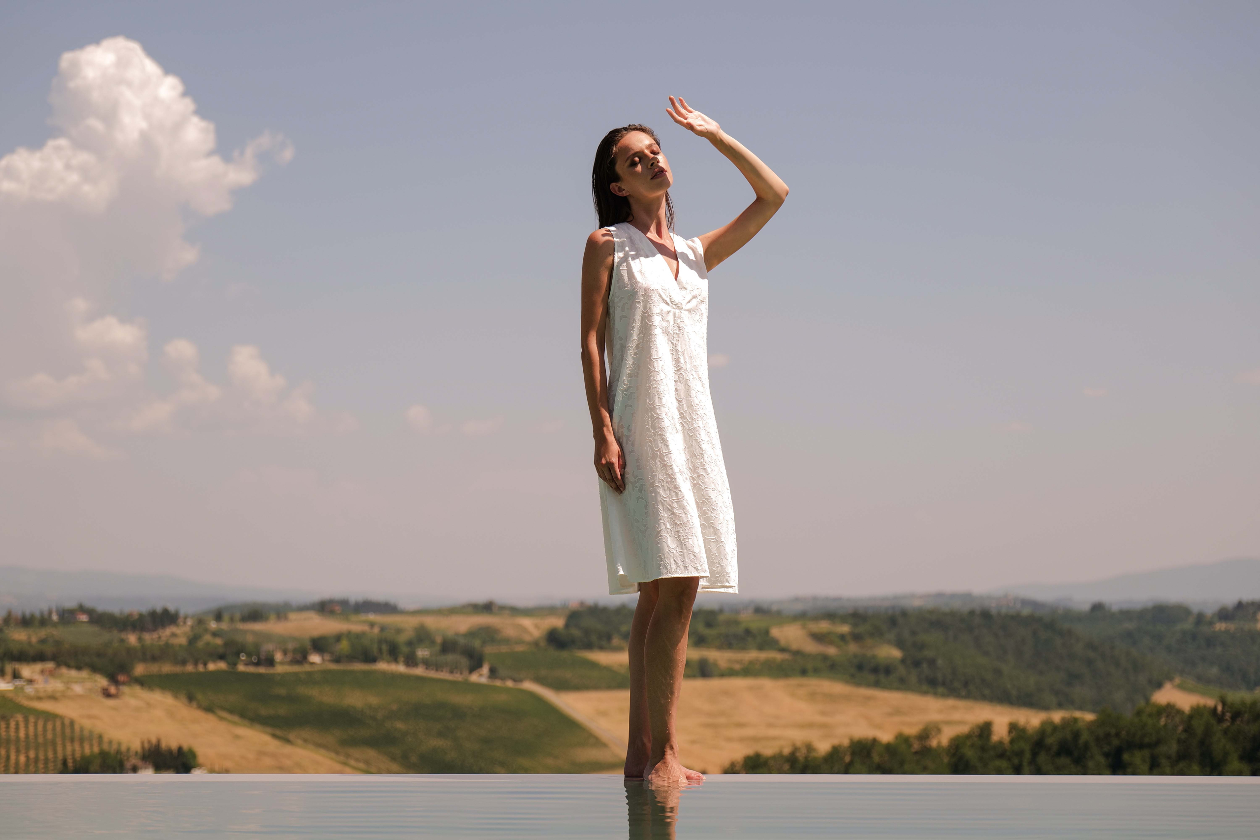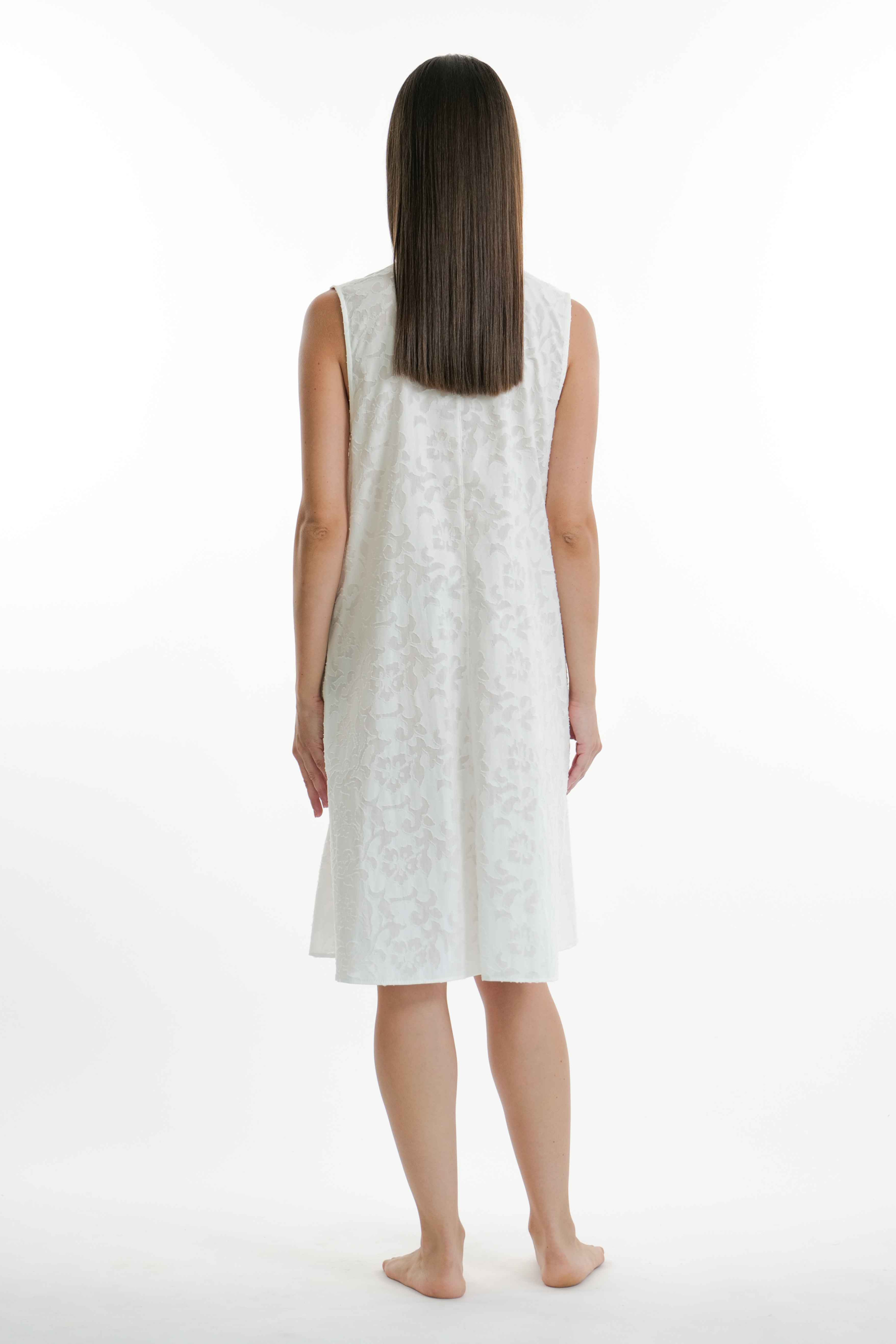 Abito in cotone jacquard con scollo a V e tasche laterali.