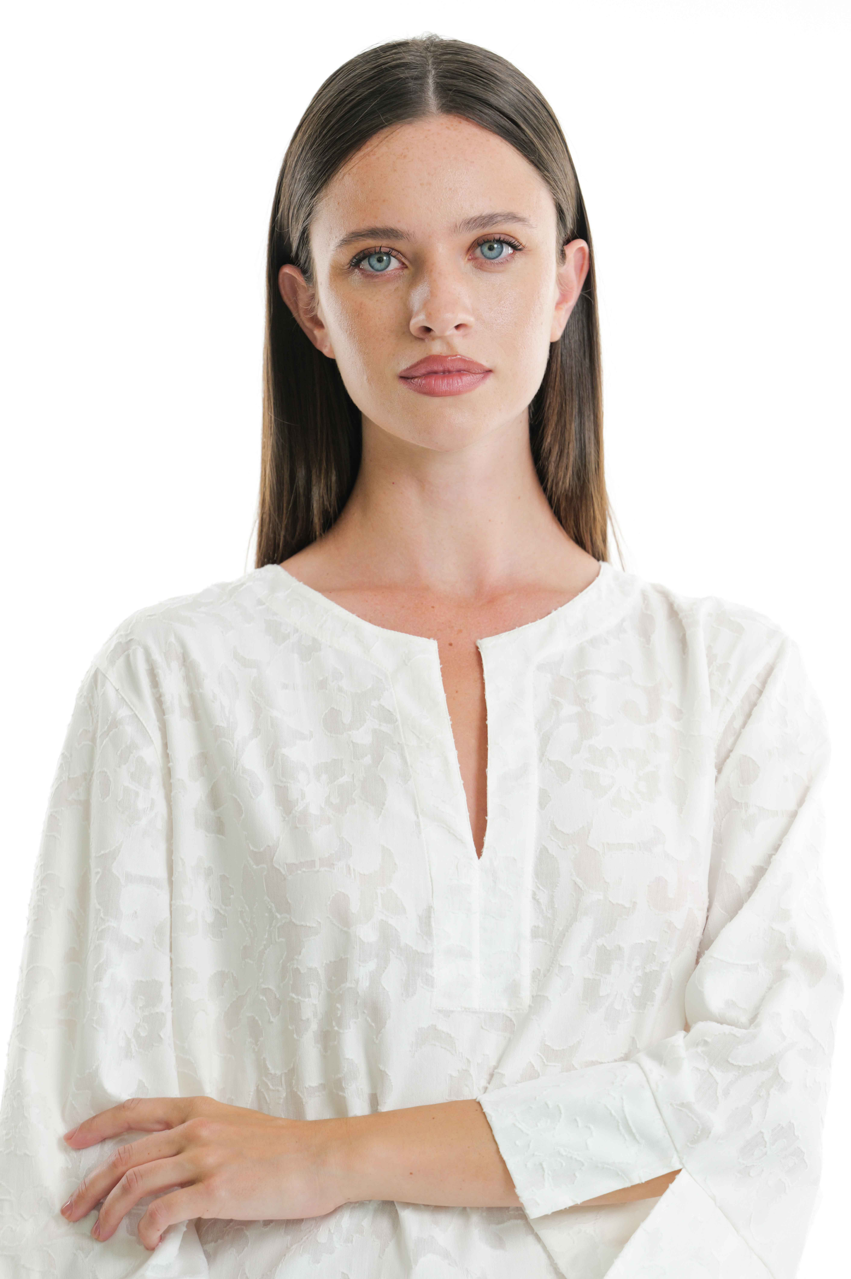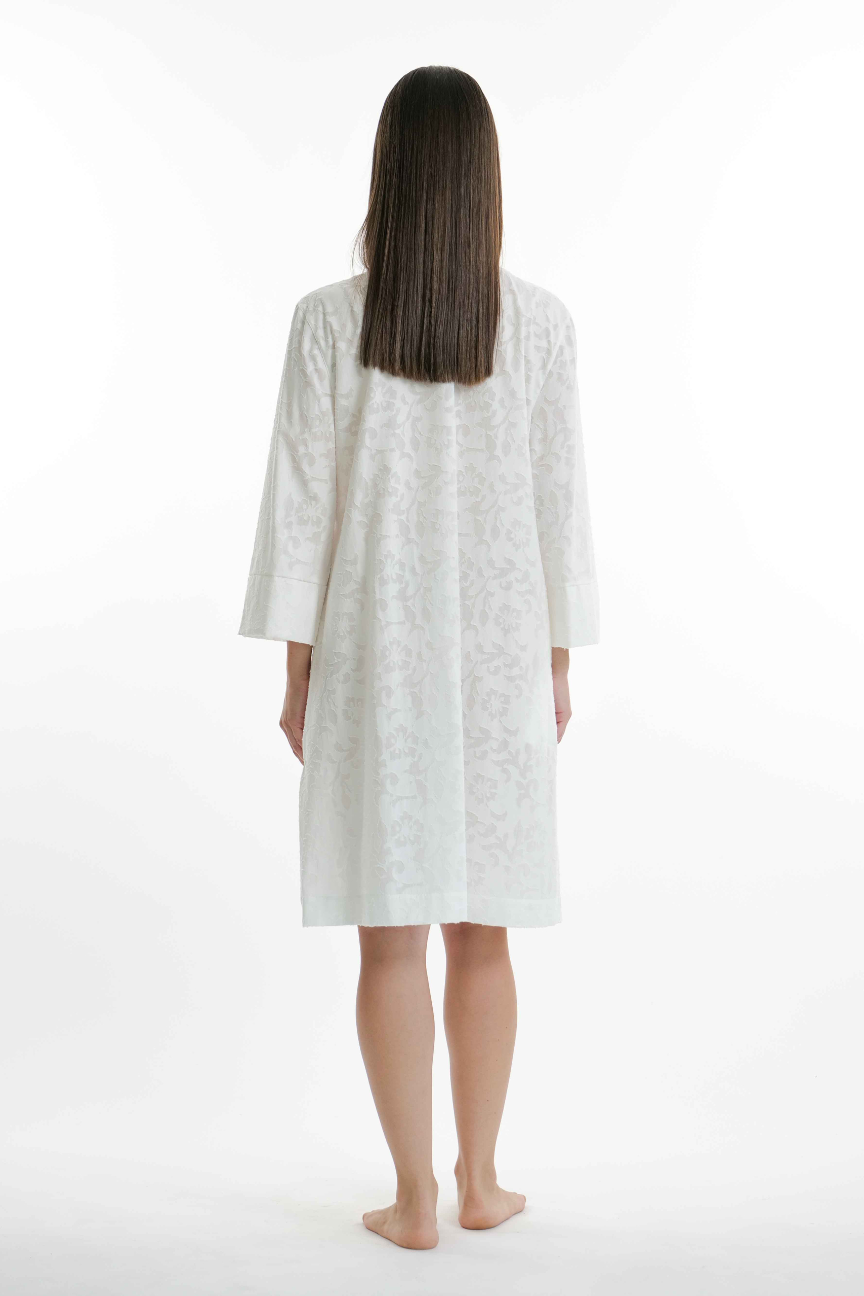 Abito in cotone jacquard con manica ⅞ e tasche laterali.