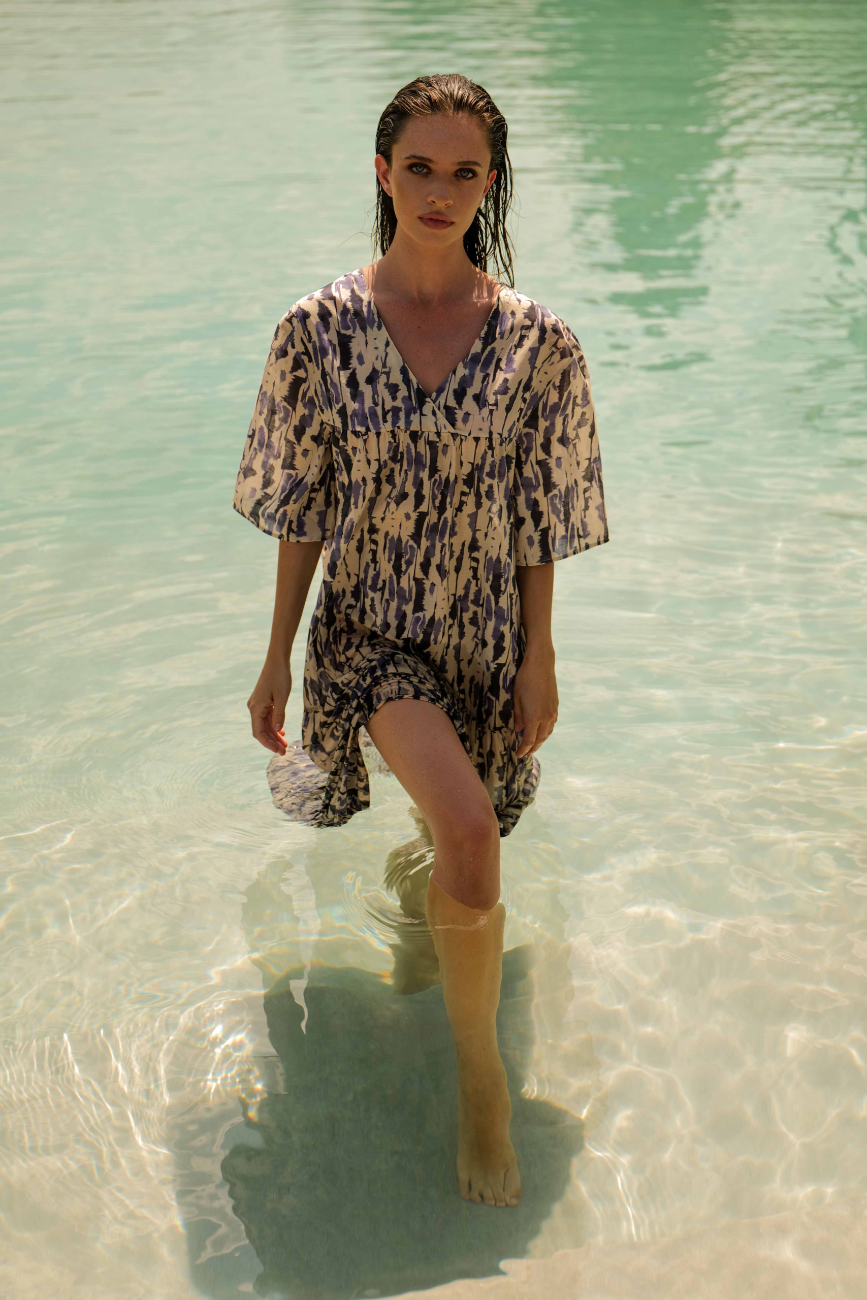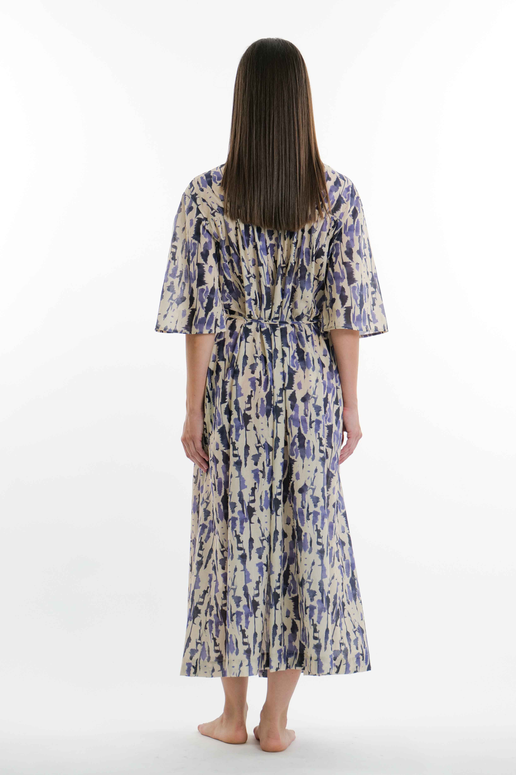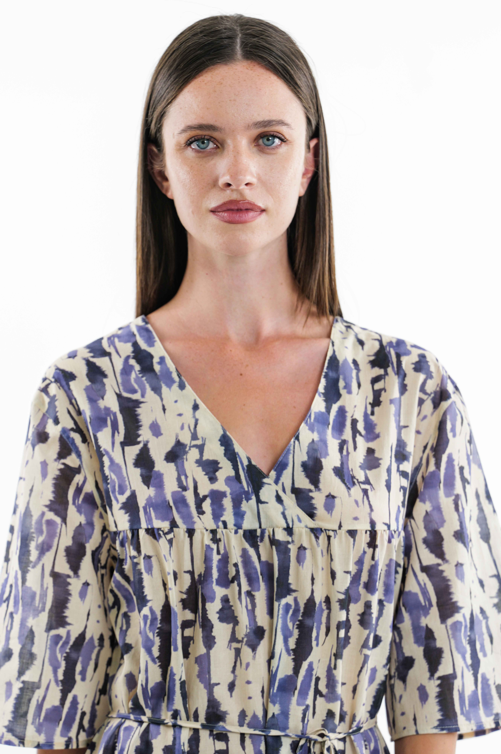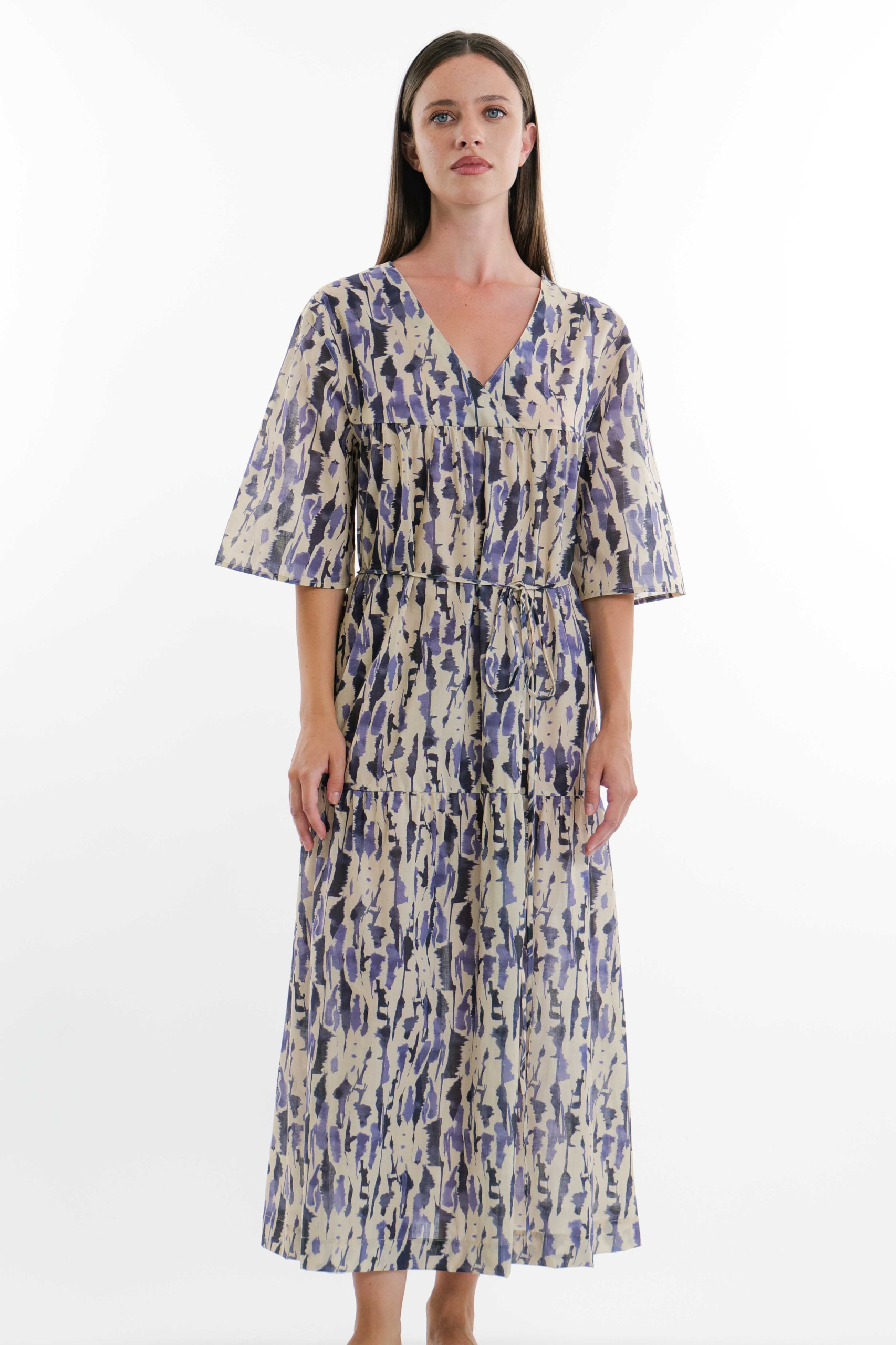 Abito in leggero cotone stampato dalla forma svasata con scollo a V incrociato, cintura in vita e tasche laterali.
