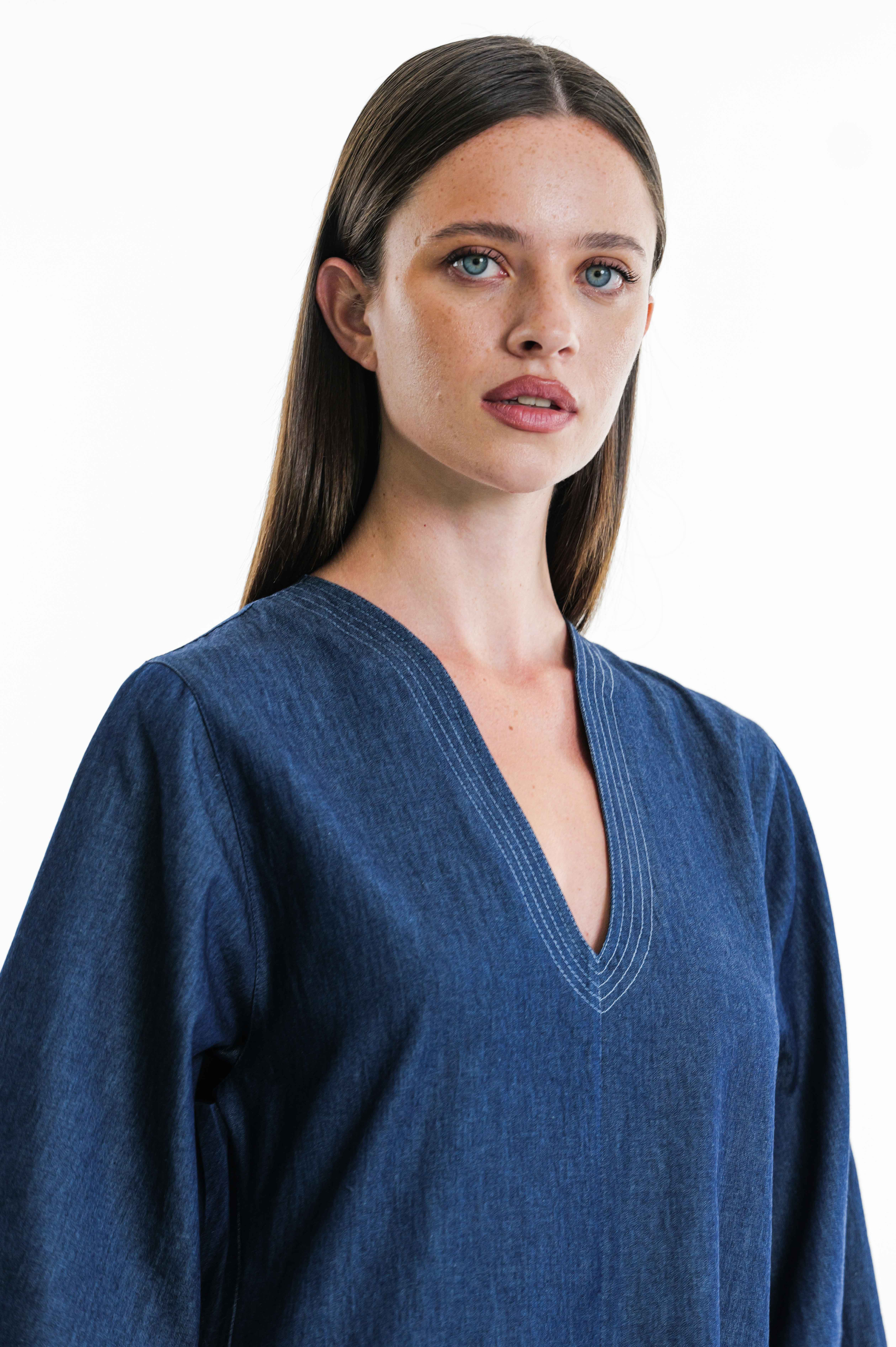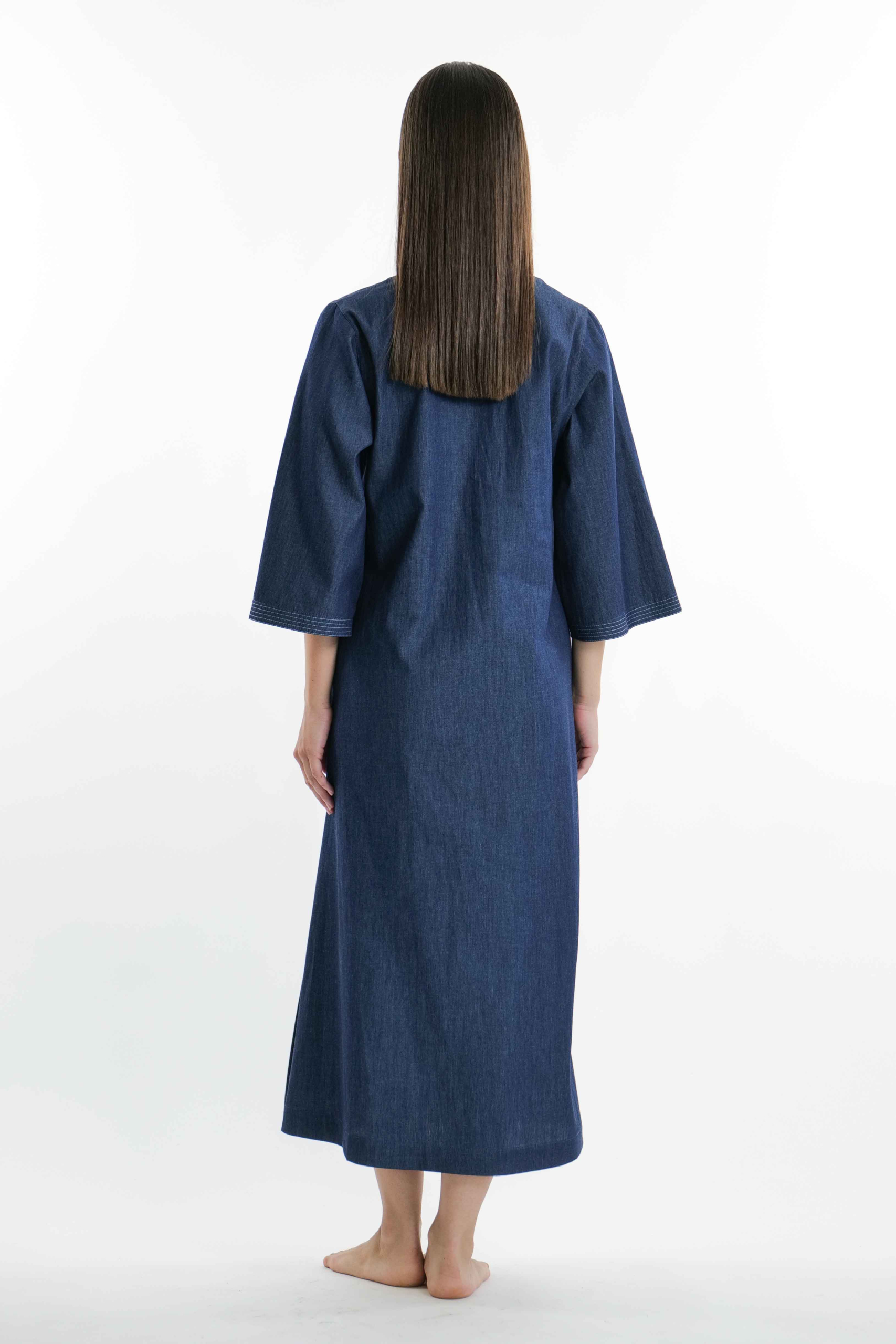 Abito in denimo di cotone con impunture in contrasto su scollo e maniche 3/4, spacco e tasche laterali.