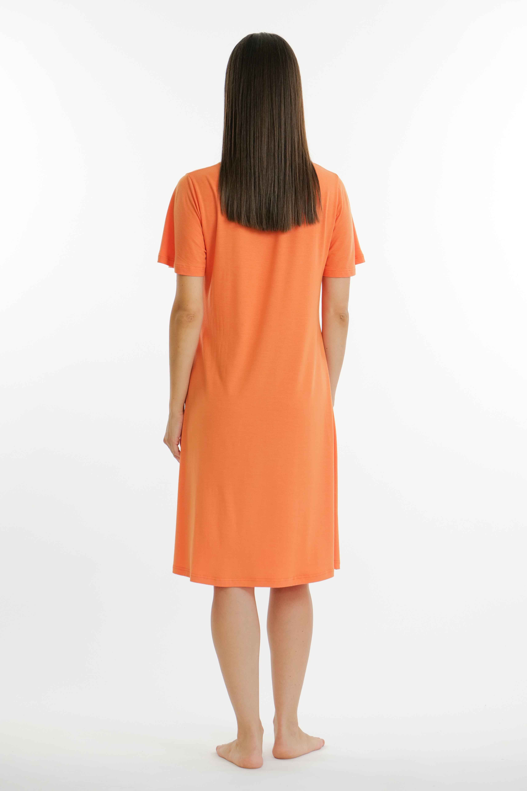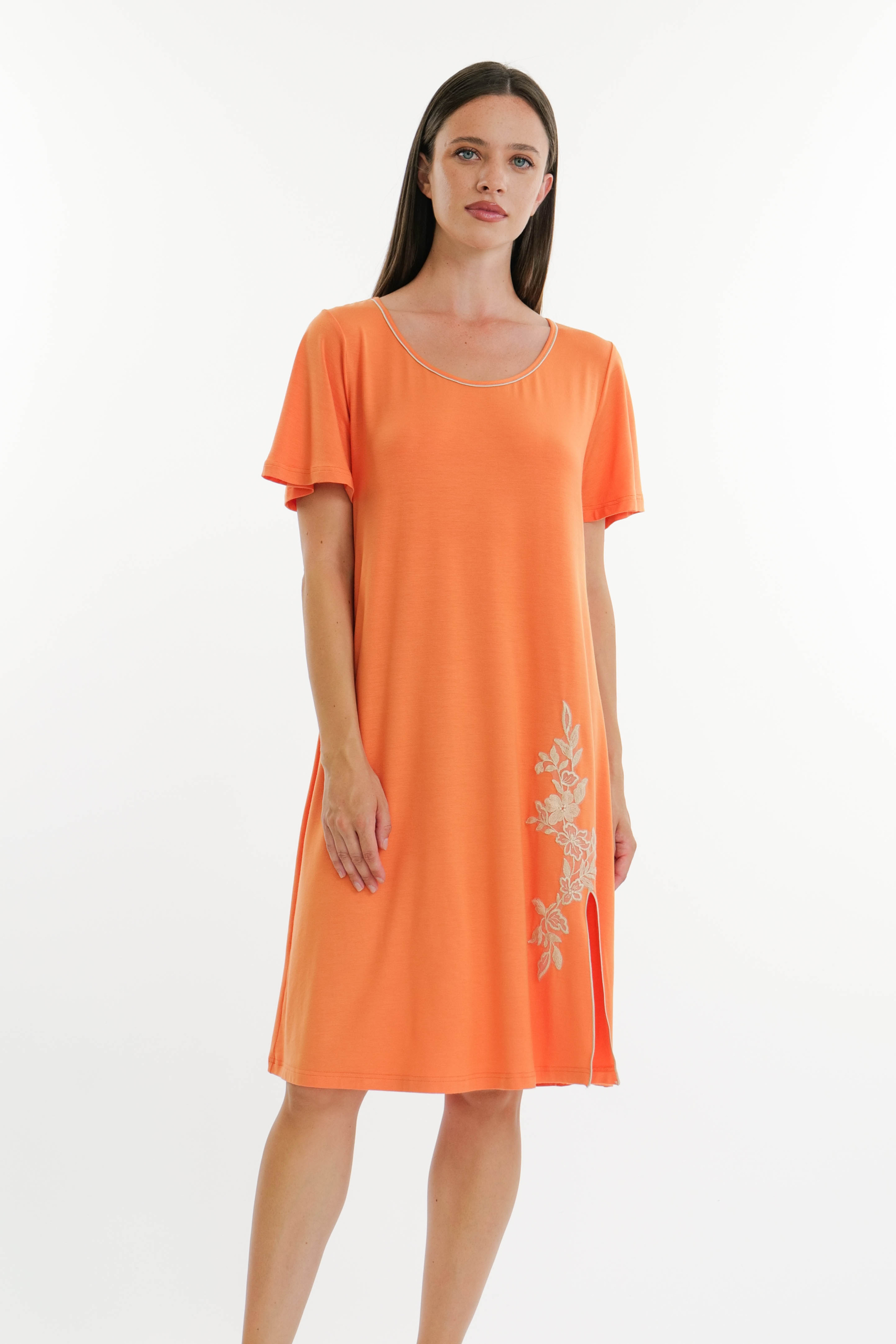 Camicia in jersey di micromodal Tencel con applicazione floreale e profili beige, mezza manica e spacco laterale.
