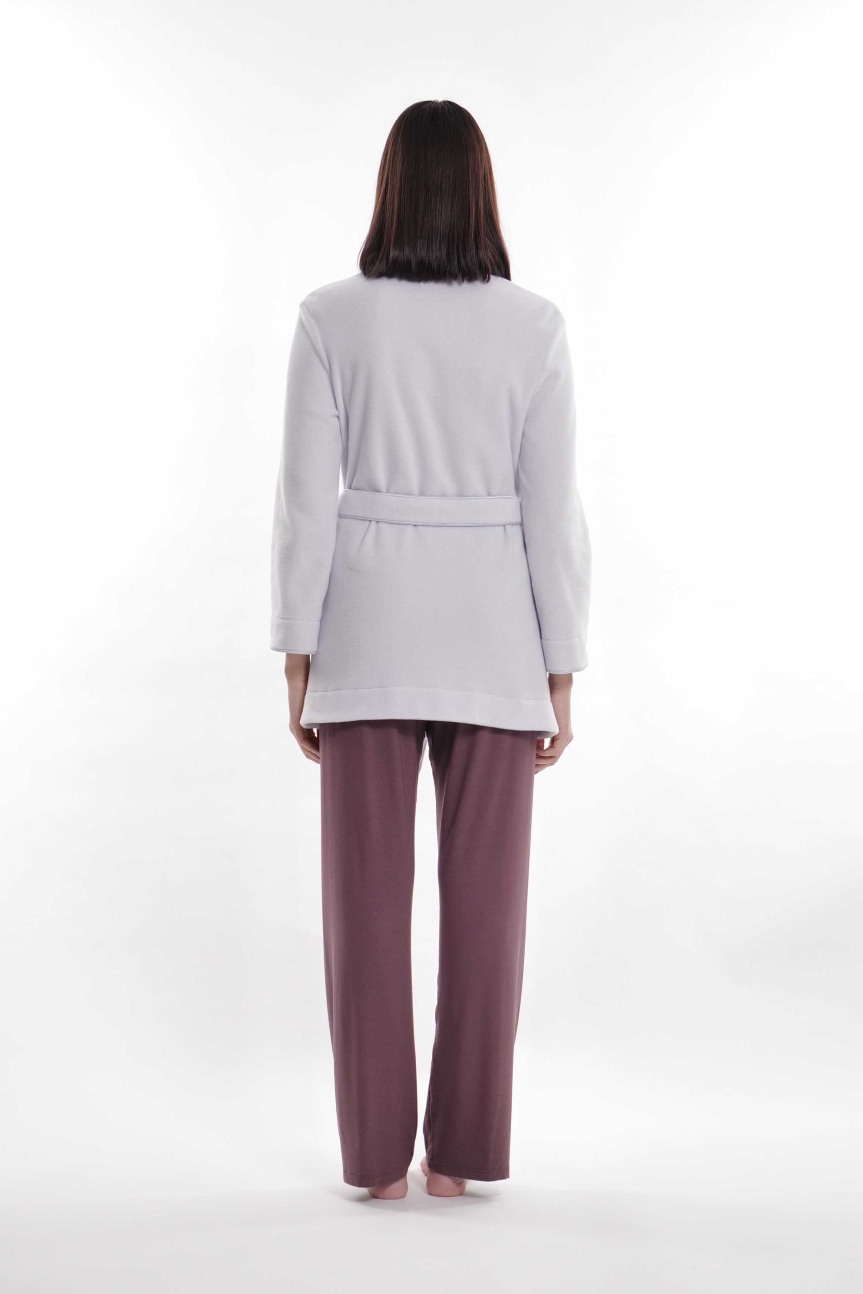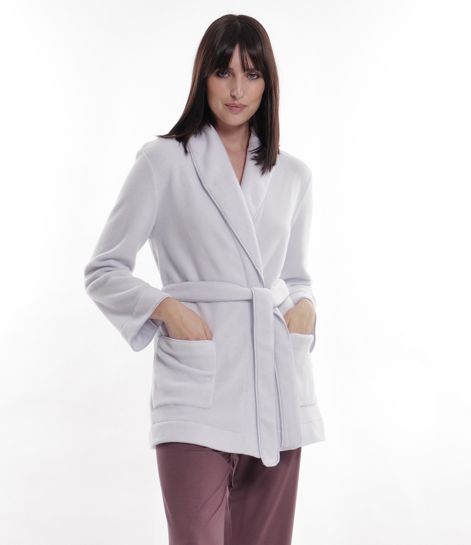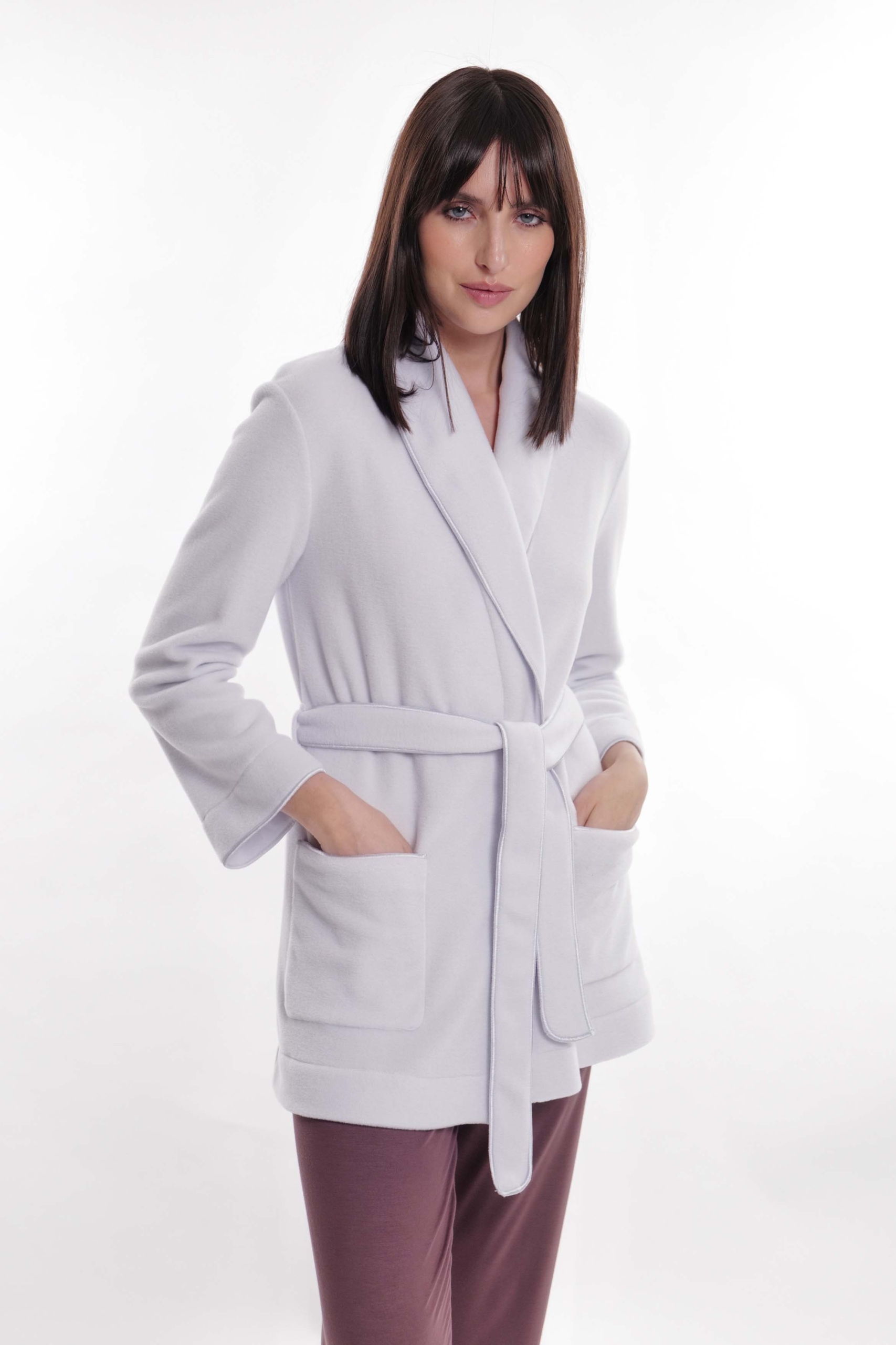Giacca in caldo pile in misto viscosa con collo sciallato, cintura e tasche frontali.