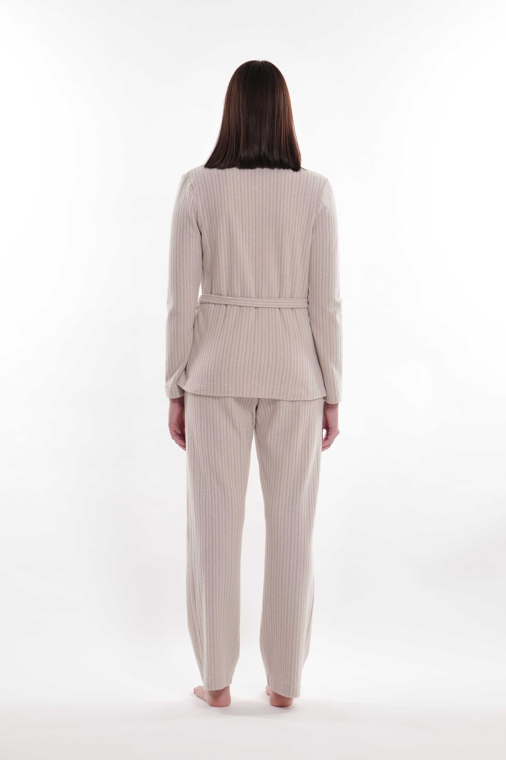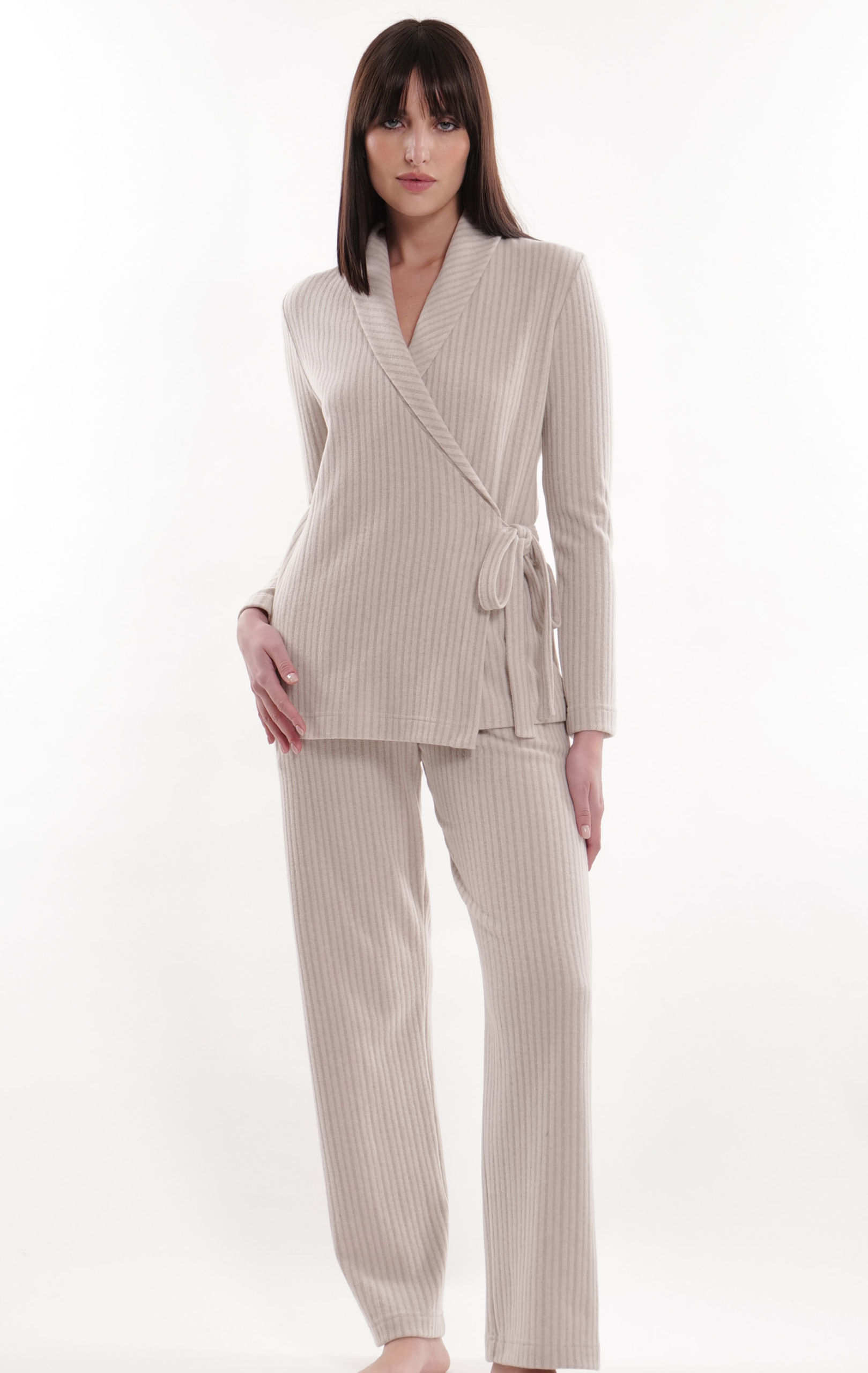 Lounge set scarto ago in misto cotone, giacca incrociata con apertura sul fianco, pantalone con tasche laterali.