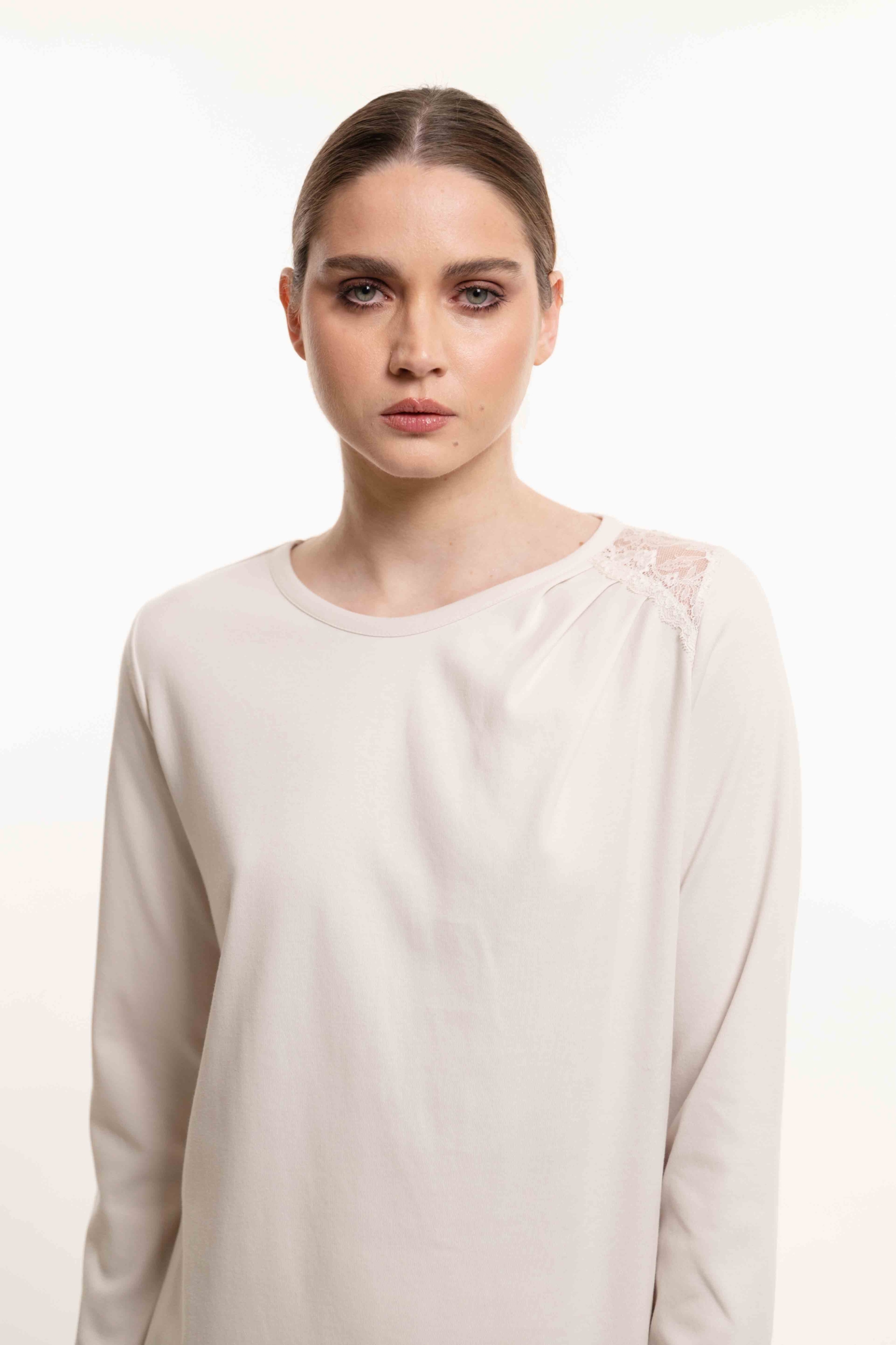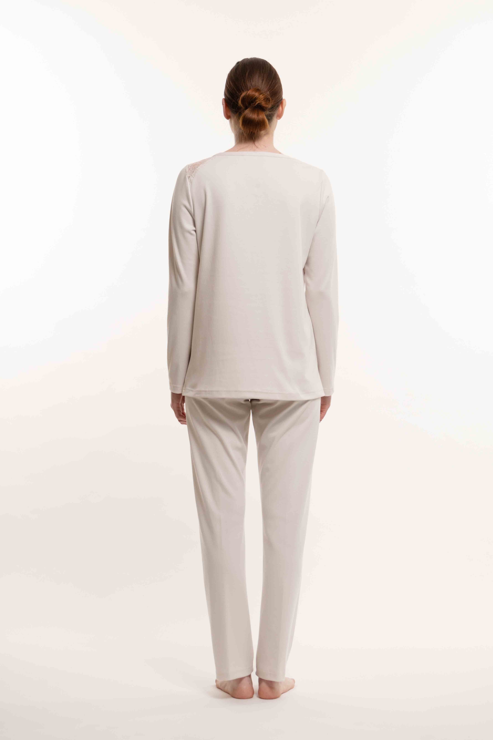 Pigiama in jersey di cotone interlock con increspatura sulla spalla ed applicazione in pizzo.