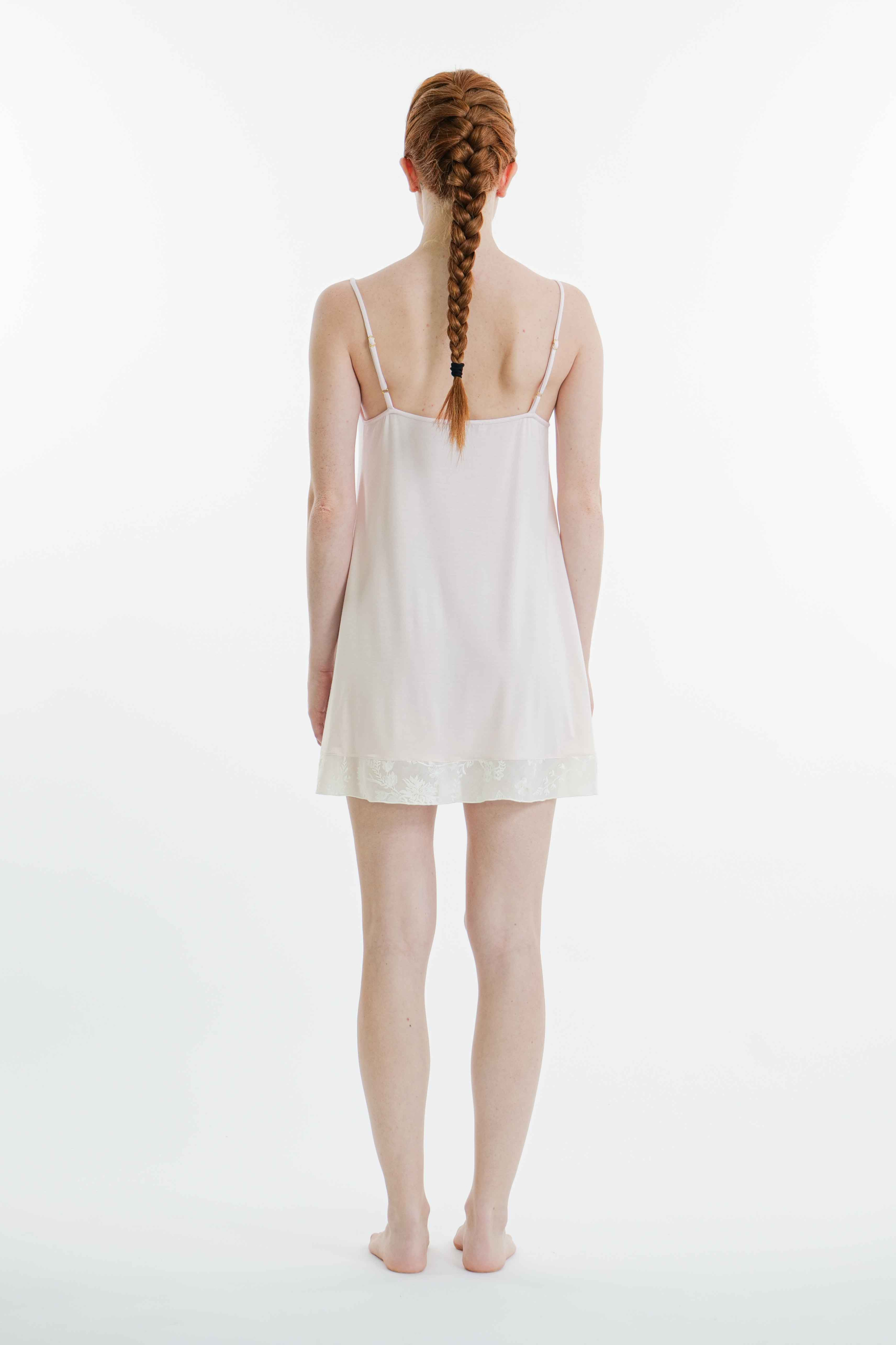 Sottoveste in jersey di micromodal Tencel con inserti in mussola di cotone su scollo e orlo; spallini regolabili.