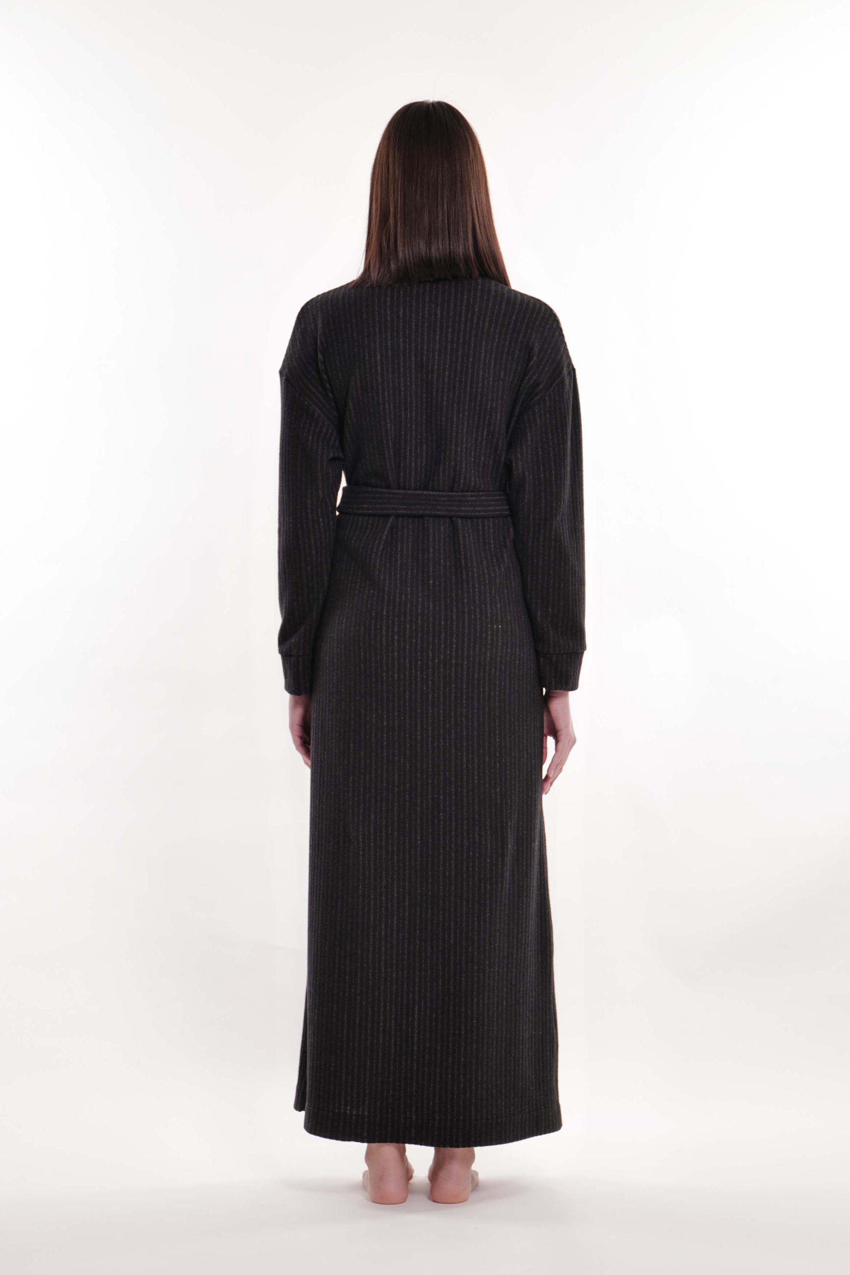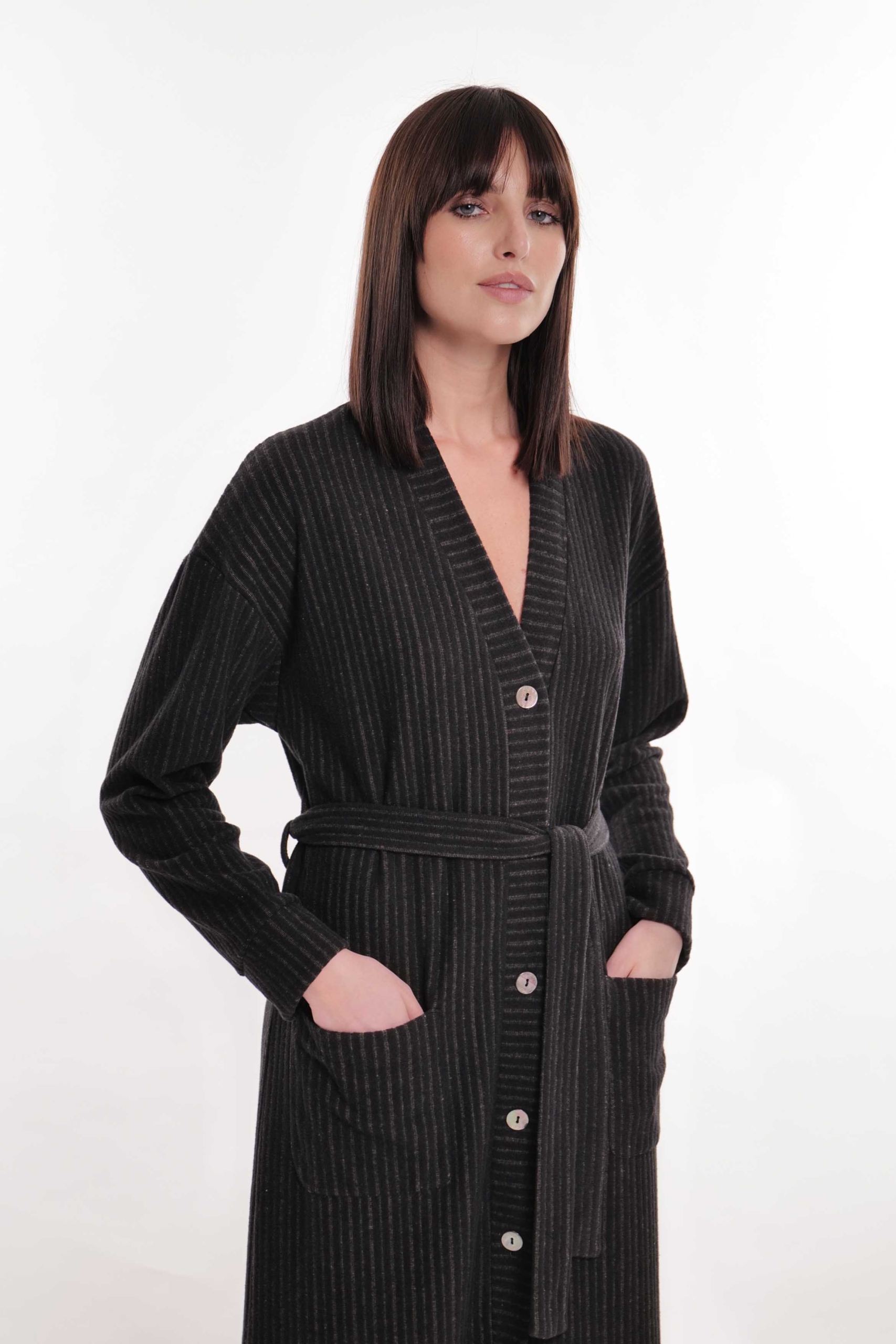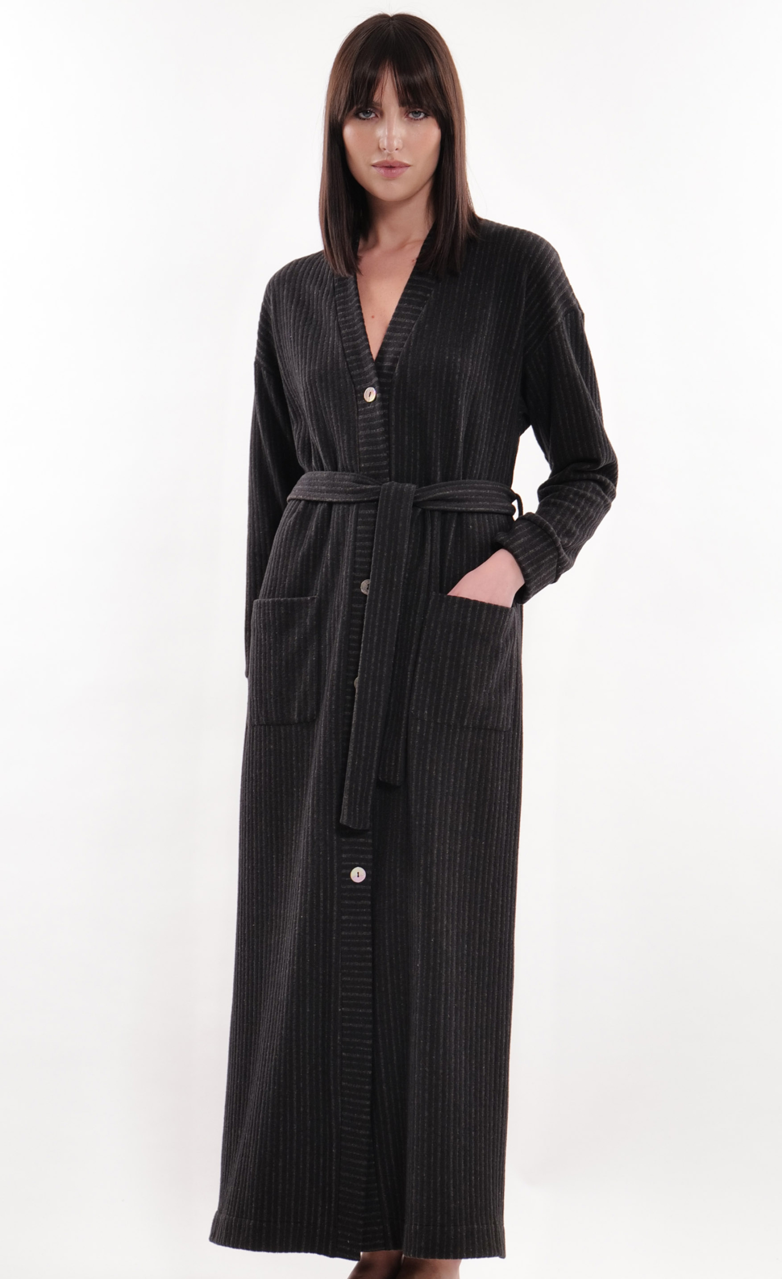 Vestaglia scarto ago in misto cotone, apertura totale con bottoni, cintura in vita e tasche frontali.